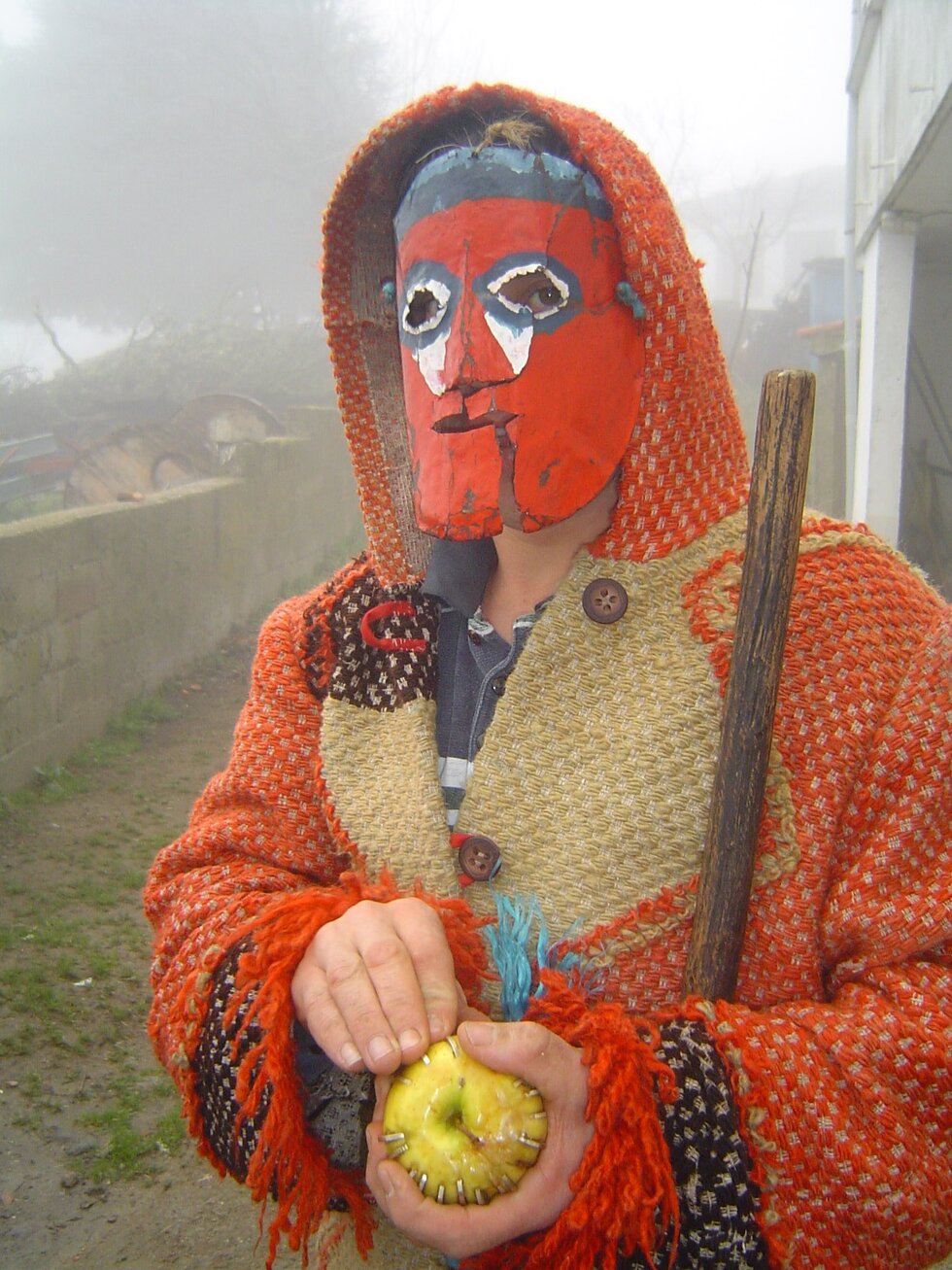 Esta mascarada se celebra el primer domingo de enero. Originalmente se celebraba el de la Epifanía. […] En la fiesta participa un Careto: un joven enmascarado que anima la fiesta y que viste un traje idéntico al de los caretos de la zona: traje rojo de franjas blancas confeccionado a partir de ropas usadas. Sus máscaras son rojas y pintan de azul las ojeras. En una mano ase una hoz para cortar el chorizo y los salchichones en las cocinas donde hay embutido y, en la otra, una manzana en la que se clavan las monedas que la gente ofrece de aguinaldo. Otro personaje es el Mayordomo de Almas cuya labor es la organización de la fiesta. Además, en la celebración acompaña un coro y música tradicional. El día de la fiesta comienza con el mata‑bicho: un pequeño almuerzo o desayuno en casa del mayordomo en el que participan tanto los miembros del coro como los caretos. Después se dirigen a la iglesia donde el coro inicia un canto de alabanza a la Virgen en la puerta, y continúan con el cantar de los Reyes. […] La comitiva visita todas las casas de la localidad recibiendo comida, bebida y ofrendas por las almas de los difuntos. En las casas donde ha fallecido un miembro recientemente se reza una oración por su alma y el cantar cambia. (https://zasnet-aect.eu/sites/default/files/documentos/Territorio%20ZOELA_Mascaradas_Inventario_96ppp.pdf)