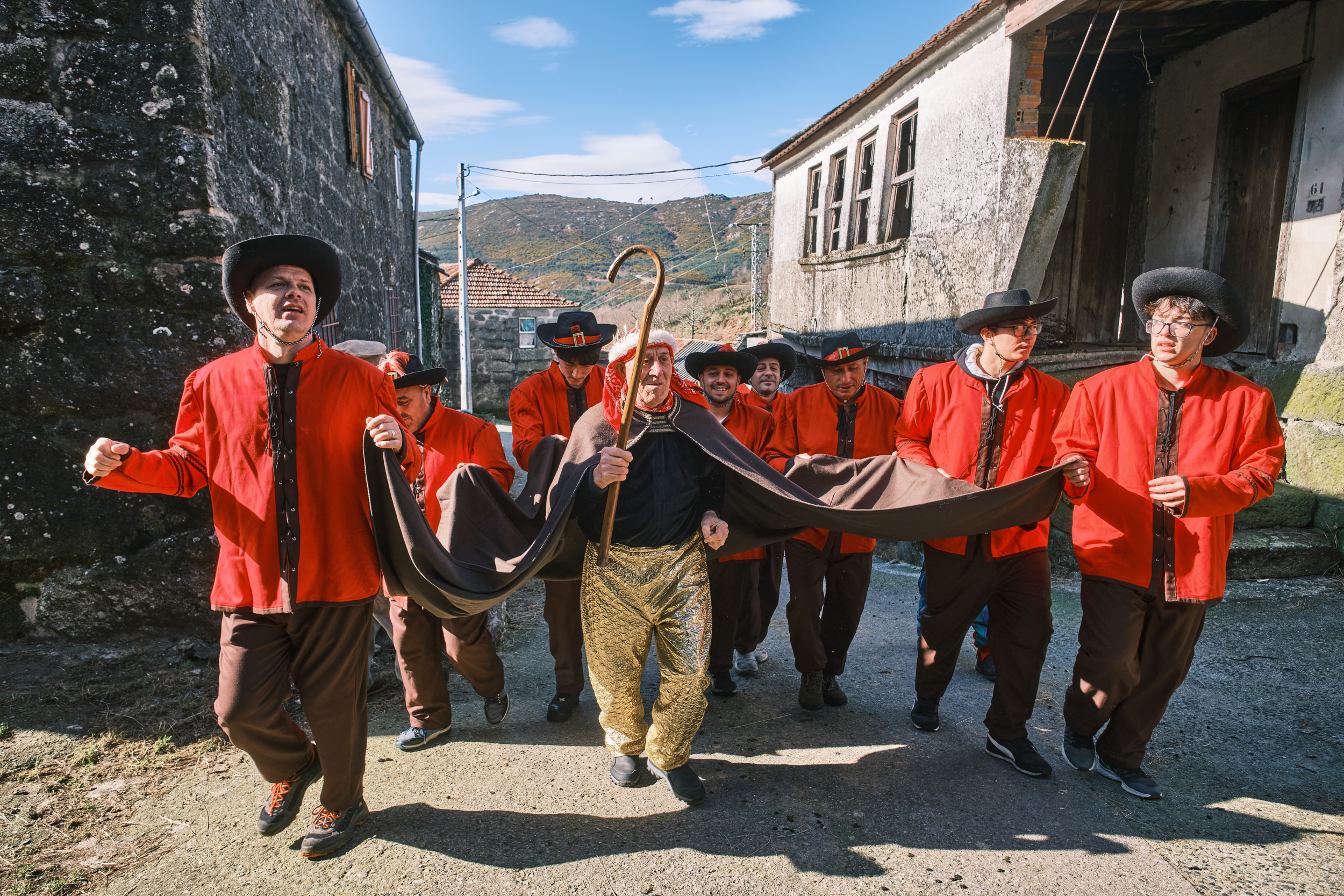 El entroido […] de la aldea de Covelo tiene una serie de rituales tradicionales muy asentados en la gente del pueblo. El personaje más importante de esta celebración festiva es «El Rey» y siempre se elige a una de las personas de mayor edad del pueblo ya que en él reside la sabiduría y encarna al «jefe de la tribu» en la comunidad. El rey va protegido por «Los danzantes» que van vestidos de rojo y evitan que «Los soldados» (de azul) le roben la corona y harán cualquier cosa para conseguirlo. (https://cenie.eu/es/el-rey-del-entroido-de-covelo)