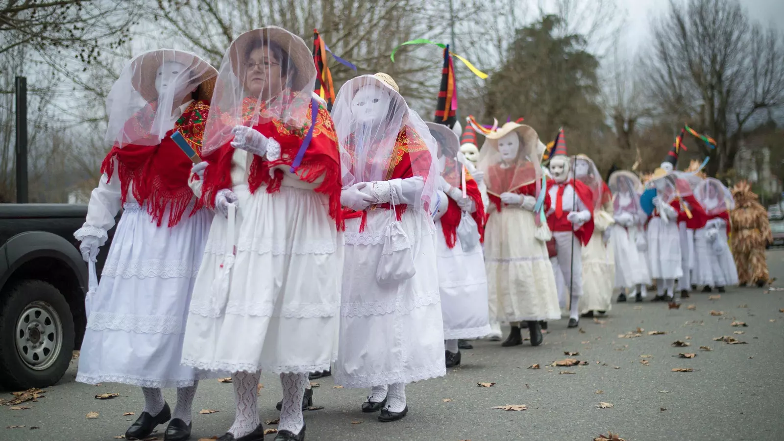 El ciclo comienza en invierno con los recuperados personajes de “Madamitas” y “Madamitos”, documentadas ya hace décadas por Otero Pedrayo, pero vueltas a la vida gracias a las mujeres rurales locales. Este Carnaval (febrero o marzo, dependiendo de la cuaresma), cuenta con jueves de comadres, fiesta popular de disfraces y desfile de madamitas/os y cabezudos, sin olvidarnos del entierro de la sardina. Los trajes de los protagonistas tienen colores blancos y rojos, enaguas y calzoncillos, con faja para él y mantilla para ella, con sombrero femenino de paja con tul y el masculino acabado en cono. Su simbolismo es, en el fondo, un recochineo a los ricos, a las familias más poderosas de la localidad. (https://fronteiraesquecida.eu/fichas/ciclo-del-entroido-carnaval/)