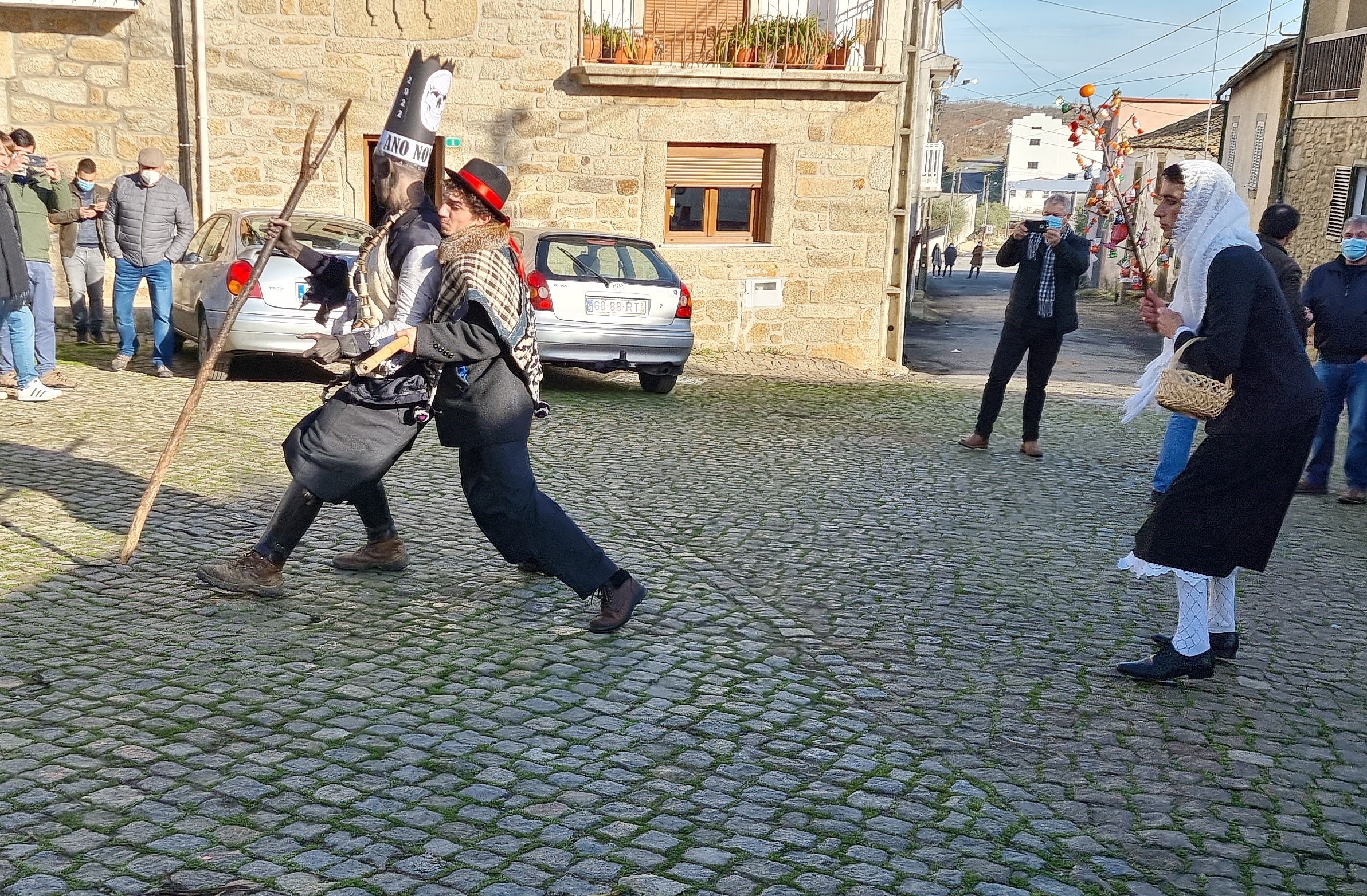La fiesta del Santo Niño de Tó en el municipio de Mogadouro se celebra en el primer día del año […]. Son cuatro los actores principales de esta festividad: el Farandulo que asume el papel de diablo, la Sécia y el Mozo y el Mayordomo. El Farandulo se presenta con la cara tiznada de carbón y las manos del mismo color, viste pantalones negros y chaqueta puesta del revés sobre la que va una manta enrollada, en la cabeza lleva un capirote de cartón azabache […]. La Sécia es un personaje femenino de aspecto delicado y frágil que representa a una mujer joven y bella […]. El mozo va muy bien vestido y se distingue por su sombrero de cinta roja que le cuelga sobre la espalda. Lleva al hombro unas alforjas de estopa. En las manos porta un palo grueso como instrumento de defensa y de protección de Sécia contra los ataques traicioneros del Farandulo, que pretende poseer la rama que ella ostenta […]. Al clarear el día de la fiesta, los cuatro personajes principales deben estar debidamente vestidos para dar inicio al ceremonial, anunciado por los gaiteros en un apresurado recorrido alrededor del pueblo. Se trata de una visitación de Buenas Fiestas y de una cuestación. El cuarteto celebrante hace la ronda formal alrededor del pueblo, al sonido de la gaita y al ritmo del tambor. En el recorrido, el Farandulo da largas a sus diabluras: marca a toda la gente que encuentra por el camino con un pedazo de corcho quemado o va hacia Sécia para robar la rama, cosa que el Mozo intenta evitar a toda costa. (https://zasnet-aect.eu/sites/default/files/documentos/Territorio%20ZOELA_Mascaradas_Inventario_96ppp.pdf)