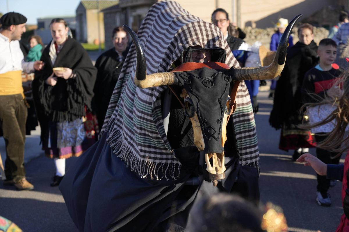 Se celebra el Domingo de Carnaval por la tarde. Los personajes son dos vacas antruejas, el Obispo, dos gañanes y dos sembradores. […]  Comienza la celebración con la llegada de los personajes encabezados por el Obispo al que acompaña de un monaguillo con un calderín con agua a modo de acetre, que continuamente echa bendiciones mojando al público. Lo siguen dos vacas antruejas Las dos van precedidas por un Sembrador con alforja al hombro que van arrojando y las siguen los gañanes con un palo que intentan controlarlas. Un niño lleva a su espalda un Pelele abrazado su cuello y cierra el séquito un grupo de mujeres con el traje tradicional, cantando al ritmo del tamborilero, que toca flauta y tamboril. Una vez en la plaza, el Obispo echa una predicación en coplas, pareados de rima consonante con referencia a temas de actualidad nacional y provincial, pero donde no faltan jamás las referencias de carácter sexual y frases con doble sentido. Cuando termina hacen un recorrido por el pueblo, sembrando las calles y animando para que salgan de sus casas a verlos para volver al lugar de origen. Allí el Sembrador esparce paja simulando que son semillas. La Vaca ahora se ha convertido en animal de labranza y dirigida por el Gañán simula arar el terreno recién sembrado. Después, suena la música y comienzan a bailar las mujeres. Es el momento que aprovecha la Vaca grande para crear desorden metiéndose entre las danzantes y hacer ademán de levantar algunas faldas. […] Después el Gañán cambia palo por muleta y torea la Vaca entre los olés del público hasta matarla. (https://zasnet-aect.eu/sites/default/files/documentos/Territorio%20ZOELA_Mascaradas_Inventario_96ppp.pdf)